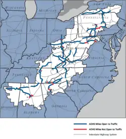 The Pennsylvania Turnpike remained the only superhighway crossing Appalachia until the interstate system that was authorized by the Federal-Aid Highway Act of 1956. Today seven Interstates cross Appalachia east to west, starting with Interstate 86, Interstate 80, Interstate 70, Interstate 64, Interstate 26, and Interstate 40. There are three Interstates crossing north to south: Interstate 75, Interstate 77 and Interstate 81. Interstate 26 in particular is undergoing an extension from Asheville, North Carolina to Kingsport, Tennessee. Among the projects associated with the extension is a future multi-million dollar bridge crossing the French Broad River in Asheville.