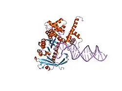 The Sleeping Beauty (SB) transposase is the recombinase that drives the Sleeping Beauty transposon system.[9] SB transposase belongs to the DD[E/D] family of transposases, which in turn belong to a large superfamily of polynucleotidyl transferases that includes RNase H, RuvC Holliday resolvase, RAG proteins, and retroviral integrases.[10][11] The SB system is used primarily in vertebrate animals for gene transfer,[12] including gene therapy,[13][14] and gene discovery.[15][16] The engineered SB100X is an enzyme that directs the high levels of transposon integration.[17][18]