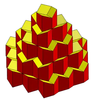 A space-filling tessellation, the trapezo-rhombic dodecahedral honeycomb, can be made by translated copies of this cell. Each "layer" is a hexagonal tiling, or a rhombille tiling, and alternate layers are connected by shifting their centers and rotating each polyhedron so the rhombic faces match up.
