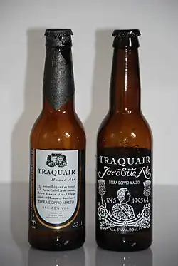 The Traquair House Brewery was revived in 1965 by Peter Maxwell Stuart, the 20th Laird of Traquair, using the 18th-century domestic brewery equipment that had previously been used to make beer for the house.[8] Ale is fermented in the original oak tuns, some of which are over 200 years old.[9] The brewery makes a range of beers, though the two main brands are Jacobite Ale and House Ale.[10]