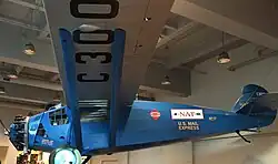 The Travel Air 5000 flying as National Air Transport's #17 aircraft on display at the former Fort Worth Star Telegram headquarters building in downtown Fort Worth, Texas.[6] In 1927, this aircraft was the first to bring passengers and mail in to Dallas & Fort Worth. National Air Transport presented the aircraft to Amon Carter as a gift in 1931.[7] The aircraft was later restored by Harry Hansen of Hamilton, Texas and Cowtown Aerocrafters of Justin, Texas.[8]