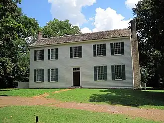 In 1799 the two-story structure with four rooms was built by politician and judge John Overton (1766–1833).[2] Overton was an advisor and close friend of Andrew Jackson, a judge at the Superior Court of Tennessee, and cofounder of the city of Memphis, Tennessee. Overton originally named the property Golgotha after the large number of prehistoric skulls that were unearthed while digging the cellar of the house.[5] Archaeologists now know that these remains were part of a large Mississippian village site. Overton changed the name of the plantation to Travellers Rest in the early 19th century to reflect the recreational effect his home had on him after the long rides on horseback that he had to undertake as a circuit judge.[6] Overton died at Travellers Rest on April 12, 1833.