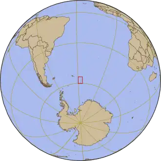 Zavodovski Island (56°18′S 27°34′W / 56.300°S 27.567°W) lies 350 kilometres (217 mi) southeast of South Georgia Island. It is the northernmost of the South Sandwich Islands and the nearest to South Georgia. The island is approximately 5 kilometres (3.1 miles) across with a peak elevation of 551 metres (1,808 feet) above sea level.[4] The stratovolcano Mount Asphyxia dominates the western side of the island while the eastern half is a low-lying lava plain.