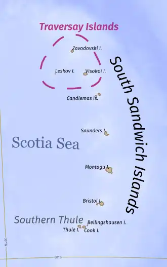 The Traversay Islands (Spanish: Archipiélago Marqués de Traverse) are a group of three islands—Zavodovski, Leskov and Visokoi—at the northern end of the South Sandwich Islands in the South Atlantic Ocean.[1][2]