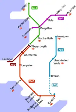 - Service 750 (Aberystwyth- Aberaeron- New Quay- Llandysul- Carmarthen- Cross Hands- Swansea- Port Talbot- Cardiff- Cardiff Bay) Operated by Bryan's Coaches[6]