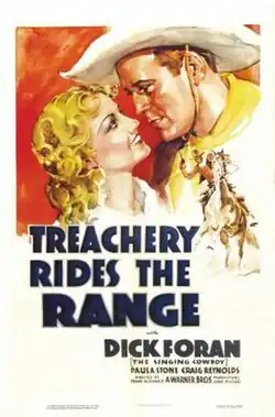 Treachery Rides the Range is a 1936 American Western film directed by Frank McDonald, written by William Jacobs, and starring Dick Foran, Paula Stone, Craig Reynolds, Monte Blue, Carlyle Moore Jr. and Henry Otho. It was released by Warner Bros. on May 2, 1936.[1]