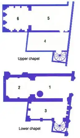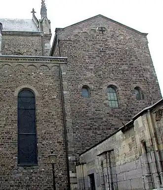 Archaeological excavations took place in the double chapel in 1981-82. Underneath the ground level floor of the Sacrarium inferior canons' grave stones were found, some dating back to the 13th century. Also, parts of walls were excavated that at the time were interpreted as the remains of a Carolingian polygonal church.[29] As it turned out, the walls belonged to polygonal transept arms of a 10th or 11th century church.[30] These remains can be seen in the basement underneath the treasury. Part of the archaeological collection is on display in the lapidarium in the eastern crypt. An important find was the 1086 funeral cross of Humbert, who was provost of the chapter of Saint Lambert's Cathedral in Liège and Saint Servatius in Maastricht. It was he who had the double chapel built which is today the church treasury.