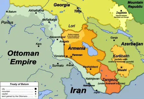 The Treaty of Batum was signed in Batumi on 4 June 1918, between the Ottoman Empire and the three Transcaucasian states: the First Republic of Armenia, the Azerbaijan Democratic Republic and the Democratic Republic of Georgia.[1][2] It was the first treaty of the First Republic of Armenia and the Azerbaijan Democratic Republic and had 14 articles.