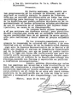 As early as March 1911 Madero's representatives met in New York with Díaz's finance minister, José Yves Limantour, and the Mexican ambassador to the US in order to discuss the possibility of peace between the two sides.[9] Limantour proposed an end to hostilities and offered an amnesty for all revolutionaries, the resignation of the then-vice president Ramón Corral, the replacement of four Díaz cabinet ministers and ten state governors by ones chosen by Madero and the establishment of the principle of "no-reelection", which would prevent Díaz from seeking yet another term as president (which would have been his ninth).[9] Madero responded positively, although he also stated that any kind of peace deal had to include an immediate resignation by Díaz.[9]