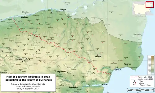 ![]() Map of Southern Dobruja, ceded from Romania to Bulgaria according to the Treaty of Craiova | |