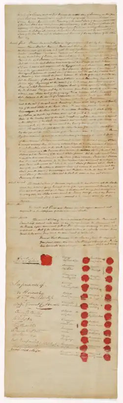 The Treaty of Fort Harmar was concluded at Fort Harmar in the Northwest Territory on January 9, 1789. National leaders representing the Haudenosaunee, Ojibwe, Odawa, Potawatomi, Sauk, Wyandot, and Lenape met with treaty negotiators from the United States, including Arthur St. Clair, governor of the Northwest Territory, Josiah Harmar, and Richard Butler.