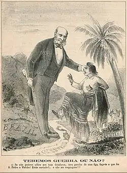 However, as events transpired, López did not launch this force on Argentina, but on Brazil. Across the border in Uruguay lived many who claimed Brazilian nationality, and Brazil complained these people were being mistreated with the connivance of Uruguay's ruling Blanco party: it was a long-standing grievance.[53] In April 1864 political agitation brought Brazilian anger to the boil.[54] In May 1864 Brazil sent a diplomatic mission to Uruguay to demand reparations, accompanied by a naval squadron; Brazilian troops massed along the border.[55][56] On 30 August 1864 Paraguay warned Brazil against military action in Uruguay,[57] but this was ignored: the Uruguayan War began. In November 1864, Paraguay fired upon and seized the Brazilian government ship Marquês de Olinda as it was steaming up the River Paraguay on its routine monthly voyage to the Mato Grosso. It proved to be carrying military stores.[58] Paraguayan armies proceeded to invade the Brazilian province of Mato Grosso.[59] Later, they invaded Rio Grande do Sul.