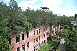 In the northwest part of the area, there is a prominent landmark, a 40.5 meter high viewing tower constructed in steel with a triangular base, whose five levels can be reached either by an elevator or via a staircase built around the elevator shaft. Access to the tree-top walk is from the third level of the tower, which is at a height of 21.6 meters. The top fifth level, at 36 meters, serves as a viewing platform.[4] On this level, there are information panels about the surrounding buildings as well as a telescope. From here, there is an excellent view of the extensive grounds of the sanatorium and, with good visibility, as far as the Fläming region to the south and Berlin to the north.