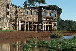 Treetops Hotel is a hotel in Aberdare National Park in Kenya ten miles (16 km) from the township of Nyeri, 1,966 metres (6,450 ft) above sea level on the Aberdare Range and in sight of Mount Kenya. First opened in November 1932 by Eric Sherbrooke Walker, it was built into the tops of the trees of Aberdare National Park as a treehouse, offering the guests a close view of the local wildlife. The idea was to provide a machan (hunting platform on a tree during shikar in India) experience in relative safety and comfort. From the original modest two-room tree house built into the top of a tree, it grew into a 35-room hotel. The original structure was replaced by a larger structure, also in the tree, but additionally supported on legs; this was burnt down by the Kenya Land and Freedom Army (KLFA) during the 1954 Mau Mau Uprising. The hotel was rebuilt near the same waterhole and became fashionable for wealthy clientele.[1] It includes observation lounges and ground-level photographic hides from which guests can observe the local wildlife at the nearby waterholes.