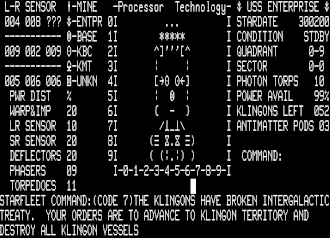 Trek-80 is a game in which the player must destroy all the Klingon ships within a time limit and cannot lose more than five supply tugs. The player uses the warp drive to move the ship for galactic travel, and impulse drive for moving through the inner quadrant. The Enterprise and Klingon vessels are armed with phasers and photon torpedoes, but the supply tugs only have phasers. The Enterprise is also able to use a ram for an attack.[1]