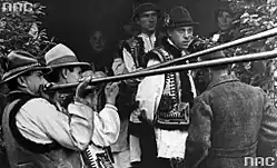 ![]() A Ukrainian highlander playing the trembita | |