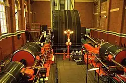 The mill was driven by a 2,500 hp triple-expansion four-cylinder steam engine by J & E Wood of Bolton built in 1907. The two halves of the engine are called Rina and Helen. They drive a 26-foot flywheel with 54 ropes at 68 rpm. The HP cylinders are steamed at 200psi. As a four-cylinder engine, it has two 44"LPs, a 40"IP, and 25"HP with a 5-foot stroke and has Corliss valves on all cylinders, Dobson block motion on HP and IP. The air pump is driven from each crosshead. It has a Lumb governor.[15]