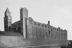 The first Trencherfield Mill was built in 1822–23 by William Woods. The site housed the first power looms in the town, and a second mill was added to the site in 1851–2. The present building was the third mill on the site, which dates from 1907. It was the largest mill constructed in Wigan at the time and the last mill in Wigan to be constructed with access to the canal.[8] It had four storeys and a basement; it was 31 by 6 bays. The chimney is circular. The design of the tower, built near an offshoot of the Leeds Liverpool canal at Wigan Pier, was influenced by the construction of St Mark's Campanile in Venice, which inspired a number of similar towers around the world.