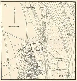 The castrum is situated shortly north east of the old centre of the village Trennfurt. Visible terrain marks of the castrum do not exist at the site which mostly consists of garden land in private property. There are no buildings on the ground. But a small part of the north eastern edge of the castrum was built over by the railway in the 1870s.[1]