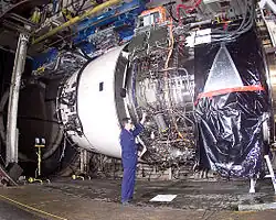 The Rolls-Royce Trent 900 is a high-bypass turbofan produced by Rolls-Royce plc to power the Airbus A380, competing with the Engine Alliance GP7000. Initially proposed for the Boeing 747-500/600X in July 1996,[2] this first application was later abandoned but was offered for the A3XX,[3] launched as the A380 in December 2000.[4] It first ran on 18 March 2003,[1] made its maiden flight on 17 May 2004 on an A340 testbed,[5] and was certified by the EASA on 29 October 2004.[6] Producing up to 374 kN (84,000 lbf) of thrust, the Trent 900 has the three shaft architecture of the Rolls-Royce Trent family with a 2.95 m (116 in) fan.[6] It has a 8.5–8.7:1 bypass ratio and a 37–39:1 overall pressure ratio.[7]