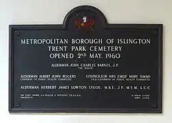 - ^ Trent Park Cemetery. Archived 2015-07-10 at the Wayback Machine London Borough of Islington. Retrieved 7 July 2015.