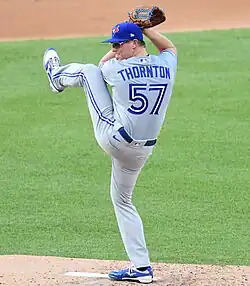 On November 17, 2018, Houston traded Thornton to the Toronto Blue Jays for utility player Aledmys Díaz.[11] The Blue Jays added Thornton to their 40-man roster a few days later to protect him from the Rule 5 draft.[12] The Blue Jays announced that Thornton had made the Opening Day roster on March 26, 2019.[13] He made his MLB debut on March 31, starting against the Detroit Tigers. He pitches five shutout innings, and his eight strikeouts established a new franchise record for strikeouts in an MLB debut.[14] Thornton earned his first career win on May 14 on the road against the San Francisco Giants, allowing two runs and striking out seven in 52⁄3 innings. He also hit two singles, the only hits of his MLB career and scored two runs in the interleague game, which Toronto won 7–3.[15] Thornton's rookie season ended with a 6–9 record and 4.84 ERA in 29 starts, the most in his big league career, and 3 bullpen outings. He led the Jays in starts, innings pitched, and strikeouts.[16] He lowered his ERA below 5.00 in the final month of the season,[17] crediting his development in part to rotation-mates Clay Buccholz and Clayton Richard.[18] Buccholz taught him new grips to his curveball and changeups.[19]