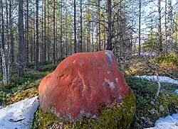 Trentepohlia jolithus occurs in cool, humid regions. It mostly grows on rocks, boulders and concrete walls,[3] but it has also been reported growing on wood.[2] It often forms large orange mats, particularly in forests in northern Europe. In Germany, it is called "Veilchenstein" or "Veilchenmoos" due to the smell of violet which emanates from the alga when wet.[3] It is widespread in Europe,[3] and may have a cosmopolitan distribution,[2] but records from tropical regions need reassessment.[3] In Mount Gongga, China, a variety of this species (T. jolithus var. yajiagengensis) forms reddish-orange mats on rocks, and has become a tourist attraction.[4]