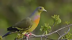 Similar in appearance to other green pigeons including the yellow-footed green pigeon and the grey-fronted green pigeon but has no maroon on the wing. The male does not have any grey on the head but has a narrow band of lilac on the upper breast with a broader orange band below. The undertail-coverts are cinnamon with the longer feathers edged yellow. The tail is grey above with a broad subterminal dark band. The females are yellow below and lack the orange or lilac bands. The undertail coverts are duller cinnamon with greenish spots. The upper tail however has the central feathers slaty grey rather than green as in females of T. affinis or T. pompadora.[2] The Sri Lankan population (T. b. leggei) is slightly smaller in wing length but otherwise similar.[3][4][5][6] Other populations that have been named as subspecies include domvilii (Swinhoe, 1870) of Hainan Island[7] and javanus Robinson & Kloss, 1923 from Java and Bali. Population praetermissa from Thailand is often included in the nominate form.[8]