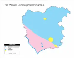 Tres Valles has a warm humid climate, with winter rainfall makingup less than 5% of the annual rainfall. The rainy season is in autumn, and June is the hottest month of the year. There is no weather station in the municipality, and the nearest station is in located in Ciudad Alemán.
