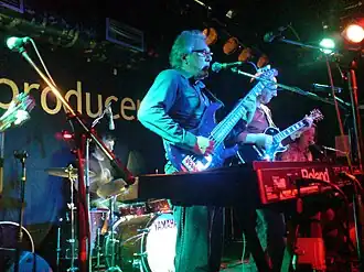 Horn went on to pursue a "succession of day jobs", including one at a rubber company.[10] He also put on a Bob Dylan imitation act for two nights a week "with a harmonica around my neck", and played the bass at odd gigs.[10] Then, at seventeen, Horn decided to pursue a career in music and "woke my parents up at 4am to tell them".[4] They were reluctant at first as they wanted him to become a chartered accountant as he performed well in maths, but Horn had failed the required exams.[4] Horn's parents pleaded with him to try one more job, but three months into his role as a progress chaser in a plastic bag factory, he was fired. "I said, 'That's it, I'm never going into that world again!'", and the next day, received an offer to play the bass in a local semi-professional band at a Top Rank Ballroom, playing top 40 and dance music for £24 a week for five nights' work.[4][10][14] Horn also received airplay on BBC Radio Leicester, performing self-written songs on a guitar.[10]