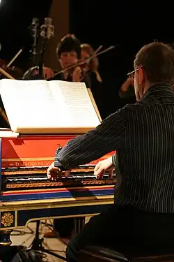 To maximise his possibilities for work early on in his career, he included in his repertoire not only the regular baroque repertoire, but also modern harpsichord concertos, including Roberto Gerhard's concerto for harpsichord, percussion and strings, Manuel de Falla's concerto for harpsichord, Frank Martin's Petite symphonie concertante for harp, harpsichord, piano and double string orchestra and Francis Poulenc's Concert Champêtre.[5][8] Pinnock and Maxim Vengerov toured together in 2000, with Vengerov taking up the baroque violin for the first time and Pinnock taking up the modern grand piano. These concerts consisted of a first half of harpsichord and baroque violin, followed by a second half of piano and modern violin.[9][10]