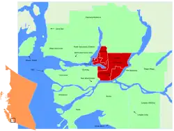 The Tri-Cities are an informal grouping of the three adjacent suburban cities of Coquitlam, Port Coquitlam, and Port Moody, along with the two villages of Anmore and Belcarra in the northeast sector of Metro Vancouver in British Columbia.[1][2] Combined, these five communities had a population of 246,701 residents in 2021.
