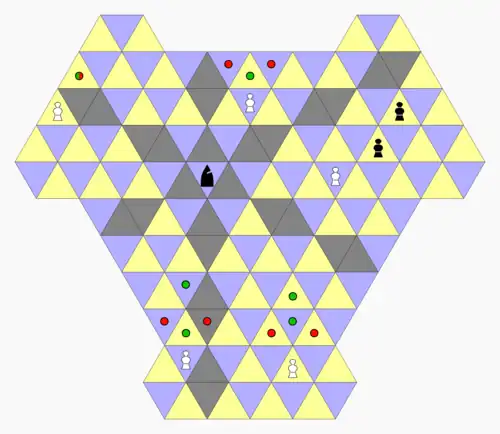 Tri-chess is the name of a chess variant for three players invented by George R. Dekle Sr. in 1986.[1][2] The game is played on a board comprising 150 triangular cells. The standard chess pieces are present, minus the queens, and plus the chancellor and cardinal compound fairy pieces per side.