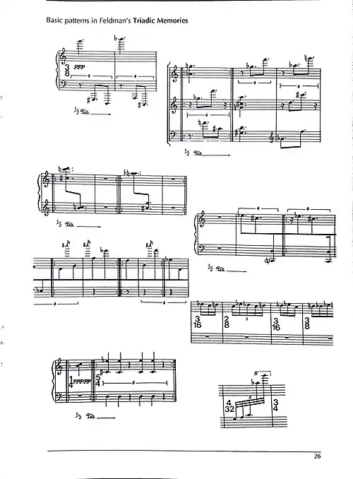 Triadic Memories is a solo piano piece composed by the American composer Morton Feldman[1] in 1981, jointly dedicated to the classical pianists Roger Woodward and Aki Takahashi. This piece heralds the composer's late period and lasts around 90 minutes.The score of Triadic Memories is published by Universal Edition (London) Ltd UE 17326. Woodward performed the world premiere at the ICA London, UK, October 5, 1981, in the presence of the composer and the French premiere at the 1997 Festival d’automne à Paris au Théâtre Molière.[2]