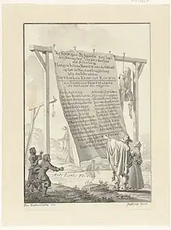 The first to be examined in early September 1618 was Ledenberg. He was hard pressed by his personal enemy the Utrecht fiscal van Leeuwen (according to some with threats of torture, though this was officially denied in a resolution of the States General) and this treatment caused him to commit suicide by slitting his throat with a bread knife on 28 September 1618 (so after two weeks).[43] According to the suicide note in the French language that he left, that was referred to in his verdict, he hoped with this desperate act to halt the trial (a not unreasonable expectation) and thereby to prevent a sentence of forfeiture of his assets.[44] But the judges had his body embalmed and retained it until his "execution" which took place posthumously after his conviction on 15 May 1619[43]
