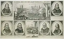 Maurice and his allies in the States General therefore felt that they had to come up with an alternative. Already in the secret resolution of 28 August mention is made of the commissioners who had accompanied Maurice to Utrecht to disarm the waardgelders there, and who had done "good work". So they were now charged with investigating the matter as commissioners of the States General.[30] These commissioners were Nicolaes de Voogd, delegate of Gelderland, Adriaan Mandemaker, delegate of Zeeland, Adriaan Ploos, delegate of Utrecht, Abel Coenders, delegate of Groningen (who was later replaced by another delegate of Groningen), and Rink Aitsma, delegate of Friesland. They were assisted by two advocaten fiscaal (prosecutors), Pieter van Leeuwen, procureur-generaal in the Hof van Utrecht, and Laurens de Silla, an advocate in the Hof van Gelderland. Hendrik Pots, who worked as a solicitor at the Hof van Holland was appointed the griffier (Court clerk). Later Anthonie Duyck was appointed as a third fiscal[31]
