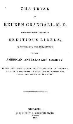 - ^ a b c d e f g The trial of Reuben Crandall, M.D. : charged with publishing seditious libels, by circulating the publications of the American Anti-Slavery Society, before the Circuit Court for the District of Columbia, held at Washington, in April, 1836, occupying the court the period of ten days. New York: H. R. Piercy. 1836. Archived from the original on September 2, 2020. Retrieved March 16, 2020.