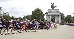 After the swim there was then a 200 metres (220 yd) transition zone in front of the main grandstand.[2] The competitors then started a 43-kilometre (27 mi) bike leg consisting of seven 6.137-kilometre (3.813 mi) laps.[2] The cyclists first rode down Serpentine Road towards West Carriage Drive before changing direction and cycling to Hyde Park Corner. The course then quickly turned left towards Hyde Park to go past Buckingham Palace on Constitution Hill.[2] After passing Buckingham Palace, the cyclists turned and went back towards Hyde Park and eventually crossed through the transition area before starting the next lap.[2]