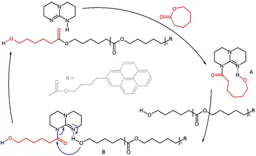 - ^ Reaction specs: initiator 4-pyrenebutanol (pyrene enables end-group determination by UV–vis) and monomer caprolactone added in ratio 1:100, targeted degree of polymerization = 100, with TBD cat. 0.5% in benzene; 72% conversion in 8 hours; polydispersity index 1.16