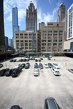 Tribune Tower sits on the southwest corner of property that includes four buildings and a surface parking lot. The other buildings are (clockwise) the four-story 1935 WGN Radio building, the eleven-story 1950 WGN-TV building, and the old Chicago Tribune printing plant, with the parking lot immediately east of all of these buildings.[4] The Tower itself was declared an official Chicago landmark by the city in 1989.[4]