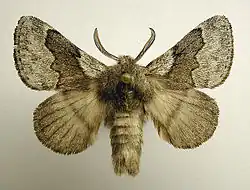 The wingspan is 25–30 mm. The forewings are grey or dark grey, whitish-sprinkled. The lines are white, internally blackish-edged, the first curved, the second twice sinuate. The subterminal line is indicated by an irregular whitish suffusion. The hindwings are light grey, darker posteriorly with a cloudy pale or whitish median line, anteriorly edged with dark grey. The larva is black, grey, or whitish marked with black, hairs reddish-brown. In pale specimens there is an irregular dark dorsal band; subdorsal series of brown-red spots, sometimes separated by whitish ochreous spots.[1]