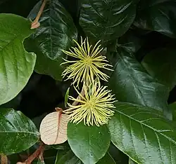 Flowers: Ranging in colour from yellowish green to cream, the spiky, ragged axillary or terminal heads are about 2 cm in diameter, and closely resemble Hamamelis in shape. Male and female parts are borne on separate flowers, either on the same specimen or different specimens (may be either monoecious or dioecious). Flowers from September to December.[1]