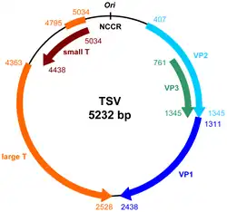 Like all polyomaviruses, TSPyV has a circular double-stranded DNA genome of around 5.2 kilobases. The genome was originally reported to contain five genes in an organization typical of polyomaviruses, with the small tumor antigen and large tumor antigen genes located in the "early" region of the genome expressed early in the infection cycle, and the viral capsid genes VP1, VP2, and VP3 expressed from the late region.[2] A subsequent study of gene expression during TSPyV infection identified messenger RNA consistent with middle tumor antigen, an early-region protein whose homologs had previously only been reported in polyomaviruses that infect rodents. Middle tumor antigen in mouse and hamster polyomavirus has been closely associated with these viruses' ability to cause tumors. The same study also observed evidence of an additional protein, called tiny T, and of an alternatively spliced form of large tumor antigen known as ALTO.[7]