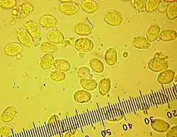 The spore print is white.[6] The spores are elliptic (or narrowly so), and measure 8–12 by 4.8–6.2 μm. There are clamp connections present in the hyphae.[8] The basidia (spore-bearing cells) are four-spored, club-shaped, and measure 23–30 by 8–10 μm. The hymenium lacks cystidia. The cap flesh comprises homogenous, interwoven hyphae that are 3–5 μm in diameter, while the cap cuticle is a layer between 200 and 300 μm thick comprising interwoven, gelatinous hyphae up to 4 μm in diameter.[2]