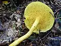 The cap is 2–5.5 centimetres (3⁄4–2+1⁄4 in) wide. The gills are mostly adnate. The stem is up to 5.5 cm long and 9 millimetres (1⁄4 in) thick.[2] The flesh is yellow and the spore print is white.[2] It is regarded as nonpoisonous.[3]