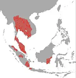 Croaking gouramis can reach an average size of about 5 centimeters, though some individuals can grow as large as 6 or 7 centimeters. Coloration is highly variable, ranging from pale brown and green to dark purple with black or red spots on the fins. 2–4 brown or black stripes or rows of spots are present on their sides. Median fins have a thin iridescent blue coloration on their edges. The iris of the eye is bright blue or purple. Females tend to be paler than males, have a slightly rounded dorsal fin and a shorter anal fin.[3] Most croaking gouramis live for about 2 years but with proper care can live as long as 5 in an aquarium setting. They are native to stillwater habitats including ponds, canals and paddy fields in Java, Borneo, Sumatra, Malaya, Thailand, Laos, Cambodia, and Vietnam.[4] A breeding population is known to exist in a series of drainage ditches in Palm Beach County, Florida, USA, almost certainly introduced there through the aquarium industry.[5]