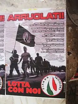 Recently Tricolour Flame has been peculiar, among Italian neo-fascist organizations, in actively trying to attract the young masses and renewing its political practices and communication techniques in a more modern, innovative fashion. Political manifests often tend towards attractive, modern graphics and clear-cut, even humorous slogans. Tricolour Flame is also very close to youth far-right organizations and initiatives, of which the most relevant is CasaPound, a social centre in Rome.