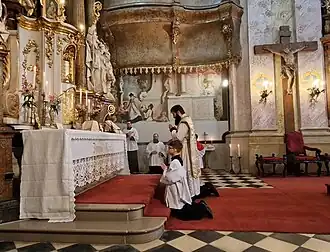 Pre-1962 forms of the Roman Rite, which some individuals and groups employ,[47] are generally not authorized for liturgical use, but in early 2018 the Ecclesia Dei Commission granted communities served by the Priestly Fraternity of Saint Peter an indult to use, at the discretion of the Fraternity's superior, the pre-1955 Holy Week liturgy for three years (2018, 2019, 2020).[48]