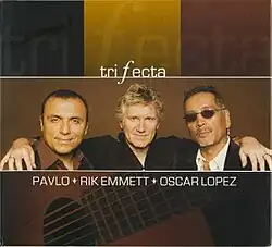 Trifecta was the debut album released by the guitarist Pavlo, Rik Emmett, Oscar Lopez.[1] It originated with Pavlo’s long-standing inspiration by the famous guitar trio project of Paco de Lucía, Al Di Meola and John McLaughlin, Pavlo wanted to create a Canadian Guitar Trio. When many thought it would be too difficult to collaborate with other musicians that were famous within their own genres, Pavlo called on legendary guitarists, Oscar Lopez, and Hall of Famer, Rik Emmett (lead guitarist from rock group, Triumph).
