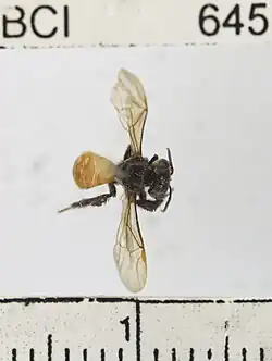 Trigona fulviventris individuals are morphologically characterized by the expression of two projections, called tubercles on their labra as well as the presence of four mandibular teeth.[4] The two identified subspecies of T. fulviventris, T. f. fulviventris and T. f. guianae, can be distinguished by differences in metasomal coloration.[4] T. f. fulviventris metasoma are rust-colored with some differences in tone between individuals, while T. f. guianae metasoma and the rest of the body are black, sometimes expressing some reddish tones.[4] T. fulviventris individuals are among the largest of their genus, ranging in size from 5 to 6.5 millimeters in length.[2]